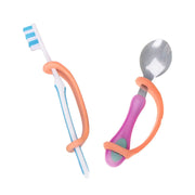 EazyHold Orange Two Pack 5" Stretchy silicone grips assist you in holding daily living objects when you need help with fine or gross motor skills. For eating utensils, they adapt well to traditional flatware, tableware, plastic spoons or forks, and kitchen cutlery. This eating aid fits children to adults with small hands or limbs.
