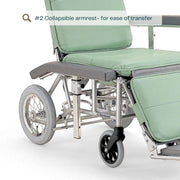 When the backrest is reclined, the foot and leg supports on the legs also move in tandem. And when transferring, the seat can be reclined to full flat, making it easy to transfer in parallel.