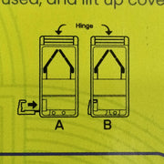 2. To lock, open the lid and insert locking bar (A) into the hole on the front side of the cutter with the tab of the locking bar pointing towards the hinge. Press until it snaps into place (B). Close the lid to the lock cutter. To remove it again, open the cutter.