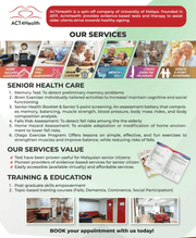 ACT4Health is a spin-off company of the University of Malaya and the business arm of the Ageing and Age-associated Disorders Research Group, Faculty of Medicine, University of Malaya. Founded in 2017, provides conducive venue for clinical research as well as delivery of evidence-based test & therapy and interdisciplinary training & education to help our clients strive towards healthy ageing.