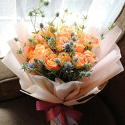 - Sunrise - Sunlight in a bouquet. Capturing the golden orange hues of roses to brighten its recipient's heart. Comes in one size, featuring imported orange roses & Eryngium blooms.